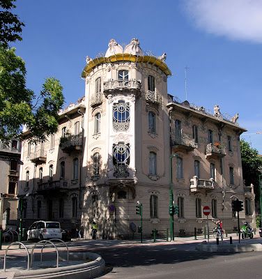 Another example of Liberty style on which Torino is fortunately rich . I'll publish more photos of this house that I love really so much. It's in Francia boulevard on the corner with via Principi d'Acaja. Pasteled pink with some blue glass.... A jewel.