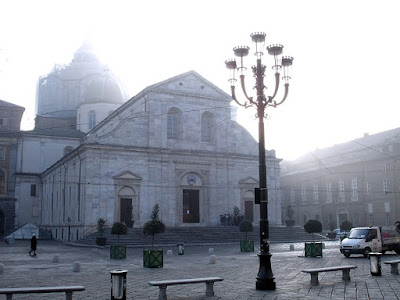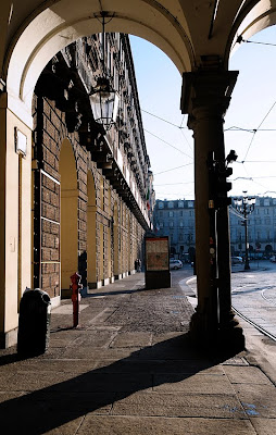 Tramonto dietro la chiesa di San Lorenzo, disegnata da Guarino Guarini di cui ho pubblicato molte foto (QUI per vederla al suo interno e, particolare la cupola). Questa foto però è strettamente connessa con un'altra che andrò a pubblicare Giovedì. Tenete presente che giusto alla fine dei portici, sulla destra, c'è il Palazzo Reale...